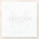 This coaster features personalized groomsman's name with title and wedding date in grey and monogram in light grey as background, in classic serif font style, on white background.