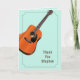 Guitar thank-you card with personalized text on front and message inside. Include the musician's name with a message of thanks in distressed printed font. Pale blue-green colour folded cards with orange, acoustic guitar image on the front.