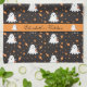 A fun black kitchen towel with a cute Halloween ghost pattern . personalized it with a name .