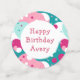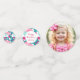 Cute personalized birthday party confetti for a little girl's birthday. An adorable frog in a birthday hat holding a gift with a cute polka dot background in pink and teal. You can upload her picture and name in the personalize area.