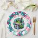Cute personalized birthday party paper plates for a little girl's birthday. An adorable frog in a birthday hat holding a gift with a cute polka dot background in pink and teal. Add name in personalize area.