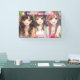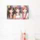 Personalized happy birthday banner. Three cute anime girl about pre-teen or teenage age, with pink and yellow flowers around them.