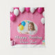 Decorate your party space with this vibrant and memorable personalized Happy Birthday Tapestry! Designed as a fun photo banner for wall hanging, it features a large arch for a custom photo, the name (e.g., Olivia Cladues), date, and a special message. The cheerful yellow background is decorated with camera illustrations and party gifts. This unique fabric tapestry is perfect as a party backdrop, photo booth prop, or a fantastic keepsake wall decor to remember the special celebration.