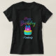 The design features an elegantly stylized two-tier cake, decorated with vibrant icing and a large bow. The "Happy Birthday" text is made with a brilliant glitter effect print, which, along with the personalized details of your name and age, makes the shirt an exclusive and joyful piece of clothing.