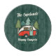 A customizable Christmas design with cozy and cute camper and pine tree illustrations. This item can be personalized with a name, message or holiday greeting. Colours include traditional Christmas colours of green, red and white, as well as dark teal and mint green. Makes a great Christmas gift for a family at the holidays.