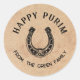 Custom happy purim family sticker with horseshoe theme for Mishloach Manot.