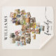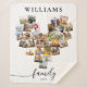Create your own custom family photo collage sherpa blanket featuring 30 of your favourite pictures in a heart shaped scrapbook style design. Personalize with family name in modern elegant typography for a custom photo gift or home decor.