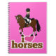 Girly pink dressage horse and rider gift, with I heart 'love' horses text. Lovely gift for girl who rides dressage horses. Brown pony tail, brown horse.