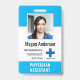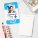 Personalize these vertical medical personnel badges with an employee photo and name, along with multiple custom text fields for hospital or healthcare facility name, unit or floor, title abbreviation, employee ID number, or valid through date, along with the medical centre logo. The title or role appears along the bottom in bold white lettering for easy identification. Customize with a barcode on the back if needed, along with return information or other details.