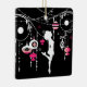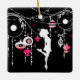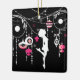 This Irish Dance Christmas ceramic ornament features a silhouette Irish Dancer dancing hard shoe performing a toe stand. There is a festive holiday background of pink and white ornaments with string lights on black. The back, of the ornament, can be personalized with a name, year or any text that you wish to add. -