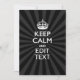 A personalized Keep Calm and Carry On saying on an elegant black and charcoal sunburst. Humourous or whimsical try on your creative words on two editable lines of text. Remember to use CAPITAL letters for best results.