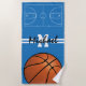 Personalized kids beach towel featuring a blue background that can be changed to any colour, a basketball court, your initials, name and and a basketball.
