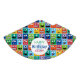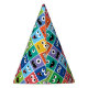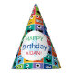 Personalized Kids Monster Pattern Happy Birthday Party Add Age Paper Hat. Funny colourful monster faces with one and two eyes in a brightly coloured square pattern. Red, orange, yellow, green, blue and purple squares in a repeated pattern. Add name and age in a white circle. Fun monster party supplies.