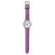 This image shows a children's watch featuring a round, silver-coloured case with a white dial. The watch has large, easy-to-read purple numbers from 1 to 12, and the hour and minute hands are also purple, with the words "HOUR" and "MINUTE" labelled on them. The name on the watch face can be customized to any name of choice, making it a personalized accessory for kids.