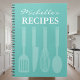 Personalized kitchen utensils recipe book spiral notebook. Save and write down your secret recipes. Elegant script typography template for name. Teal / turquoise blue or custom colour background. Add your own name. Spatula knife whisk and spoon design. Cute baking and cooking gift idea for chef mom, dad, mother, wife, aunt, sister, grandma, daughter etc. Trendy school and office supplies for home or work.