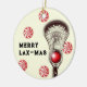Awesome lacrosse Christmas holiday ornament, unique gift tag, or creative decoration for any player or coach featuring the original "Merry Lax-mas" design. Edit name to personalize.