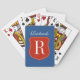 Personalized name monogram playing cards. Monogrammed playingcards with elegant typography. Family surname / last name design for games, gambling, gambler etc. Cool initialled gift idea for poker, rummy, blackjack players. Create your own for dad, father, uncle, husband, brother, son, kids etc. Red shield and blue background. Also make an classy las vegas wedding favour gift idea.
