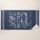Upgrade your outdoor setup at your seaside abode with this cute personalized beach towel featuring the phrase "life is better at the beach" in white lettering accented with a starfish and an oar. Personalize with your family name and/or year established beneath.