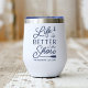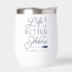 Celebrate life at your seaside abode with this cute personalized wine tumbler featuring the phrase "life is better at the shore" in navy blue lettering accented with nautical flair. Customize with your family name and/or year established beneath.