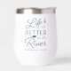 Celebrate life at your riverside abode with this cute personalized wine tumbler featuring the phrase "life is better on the river" in navy blue lettering accented with an anchor and an oar. Customize with your family name and/or year established beneath.