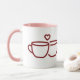 Personalize this charming mug with both your name and your partner's name. The design features two cozy coffee cups with a heart above them and the phrase "Love Brews Here" in handwritten burgundy script, perfect for couples who love coffee and each other.