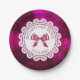 Personalized, "Its a girl" magenta and pretty white lace doilie baby shower plate.