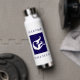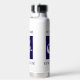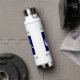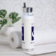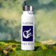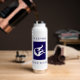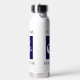 Personalized mermaid Beach House water bottle. Mermaid illustration with contemporary block text at top and bottom. Blue and white.