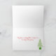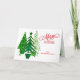 This festive Christmas card has three green potted Christmas trees with simulated green foil and gold edges. There is fancy red lettering that says "Merry Christmas" beside the trees The front is also personalized with your family name or other text.