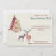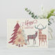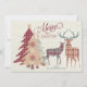 This rustic country flat Christmas card has three patterned Christmas trees in plaid, polka dots, and snowflakes patterns on muted shades of burgundy, tan, and green gold stars on top of two of the trees. There are also two plaid standing deer in a matching color scheme. The buck has dusty blue-gray antlers. There is fancy burgundy lettering that says "Merry Christmas" beside the trees The front side is also personalized with your family name or other text in blue lettering. The same elements are carried over onto the back side and several text boxes have been added to allow you to personalize the card how you want.