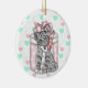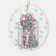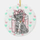 Adorable hand drawn grey kitty cat with a pink bow on with mint green and pink heart background. Personalize this ornament on the back.