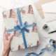 This rustic country Christmas wrapping paper has three patterned Christmas trees in plaid, polka dots, and snowflakes patterns on muted shades of burgundy, tan, and green gold stars on top of two of the trees. There are also two plaid standing deer in a matching colour scheme. The buck has dusty blue-grey antlers. There is fancy burgundy lettering that says "Merry Christmas" beside the trees. It is also personalized with your family name or other text in blue lettering or you can delete it if you don't want to personalize it.
