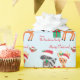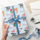 This festive and fun whimsical personalized Merry Christmas wrapping paper has cute woodland animals wearing Santa caps. It includes a brown deer, a cartoon raccoon, a brown robin, and a green present with a red bow on it. The background color is pale blue but you can change it to whatever color you want and there is customizable text for you to personalize how you want.
