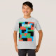 A modern abstract T-shirt with patterned with interlocking geometric shapes in red, green, black and orange. The colourful geometric pattern has a computer game appearance, ideal for gamers and tech lovers. Personalise with a name in white capital lettering near the top of the design.