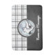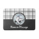 The design features a pair of ice skates over a snowflake crest and an off-white tartan pattern background. This elegant winter sports design serves as a modern and unique bath mat with personalized text.