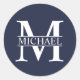 featuring personalized white monogram in classic serif font style with box of name in the middle of monogram on navy blue background.