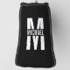 featuring personalized monogram in white bold modern sans serif font style with box of name in the middle of monogram on black background.