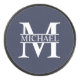 featuring personalized white monogram in classic serif font style with box of name in the middle of monogram on navy blue background.