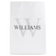 features personalized name in grey and monogram in light grey as background, in classic serif font style,