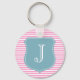 Personalized monogram keychain | initial J letter. Elegant initial letter with customizable background color. Cute gift idea for women and girls. Pink stripe pattern with turquoise emblem shield.