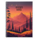 Personalized mountain and forest tree landscape night scene notebook with orange, red, yellow, and black sunset colours.