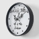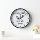This black and white Mr. & Mrs. clock features two chickens, a rooster and hen in love. They are set against a charming line drawing country farm. It can be personalized with a surname or any text that you wish to add.
