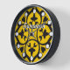 The size of the clock is dramatic and the abstract alcohol ink design is soothing and intricate at the same time. I chose the black frame that adds pop to the blue and gold design. The gold printing would be better in a slightly darker or larger font. I love it and I’m looking for just the right place in ny new apartment. I would recommend this clock for a personal gift or a present. I feel that the quality is excellent for the money! I’m a bit of a clock nut so I’m pretty particular about my purchases. The clock is larger in diameter than many if the clocks I have, so it stands out very well. I think a slightly darker printing color and a moderately larger size would best suit a professional decor or add more impact in a work place item.