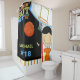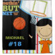 Boys basketball theme shower curtain for the boy who loves and plays basketball, features a stick figure boy with black hair, basketball, basketball net and backboard, text that reads Nuthin' But Net, and an area you can easily personalize with his name and jersey number!