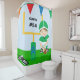 Boys football theme shower curtain for the boy who loves and plays football, features a boy football player in a green uniform and helmet, goal post, flags, and an area you can personalize with his name and number!