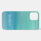 Personalized name aqua watercolor iPhone 12 case. Handdrawn water colour painting with handwriting typography. Cute handwritten text template for name or monogram. Stylish design for women and girls. Beach theme background image. Sea green and turquoise blue colours.