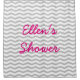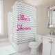 Personalized name chevron pattern shower curtains. Elegant grey chevron zigzag pattern shower curtain with neon pink text template. Stylish script typography. Zig zag stripe bathroom accessories for men and women. Cute print design. Custom size and colour. Trendy home decor.