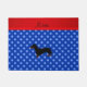 Modern, trendy, chic and girly blue polka dots pattern with a red stripe with a black and brown dachshund wiener dog personalized with your name gifts or monogram gifts or your initials or you can add your own personal text. Pretty dachshund gift ideas for pet owners and dog lovers.