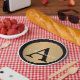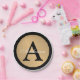 Personalize these gold metallic look button outlined in black round paper plates with any surname and single custom monogram.