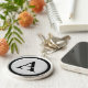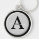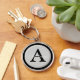 Personalize this silver metallic look button outlined in black round keychains with any surname and single custom monogram.
