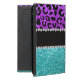Neon purple glitter cheetah animal print pattern background and bright aqua / turquoise glitter (not real glitter) black diamonds stripe (faux diamonds, not real) with hearts and dots personalized with your name gifts or monogram gifts or your initials. Ideal for weddings, save the date, birthdays, and much more featuring an elegant and traditional fancy lettering